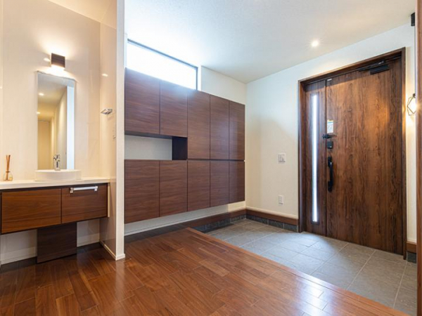 ■玄関すぐに独立洗面台を設置。各階トイレも備え、手洗いや動線の利便性に配慮