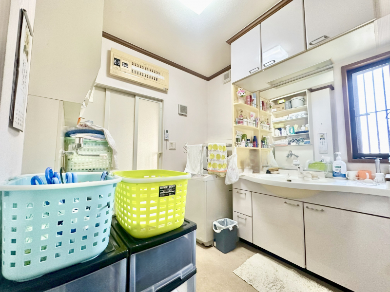 広々とした洗面所で各所に備え付けの収納あり。