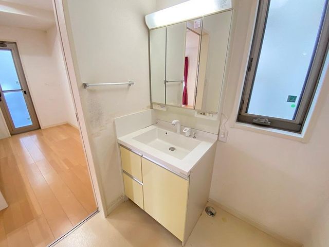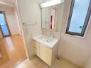 【洗面室】2方にスライドタイプの出入り口扉有。シャワー水栓+3面鏡付きの洗面化粧台が設置されています。