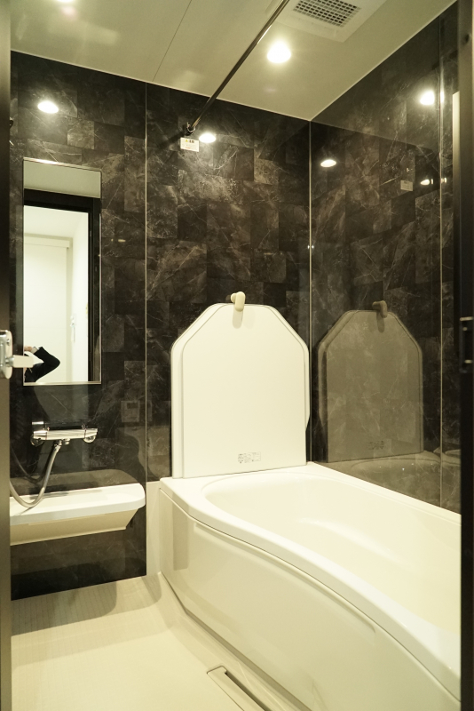 【浴室】 落ち着きのあるシックなデザインの浴室。浴室乾燥機付きで雨の日も困ることなく干すことが可能。
