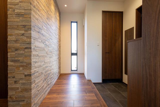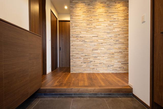 ウォルナットの床や建具に、石目調のタイルが印象的な玄関ホール!木の温もりを感じられる空間です。