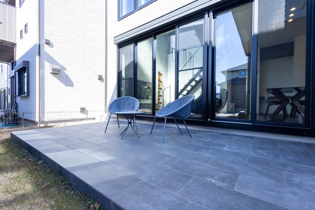 メンテナンスフリーなタイル敷きのテラス キッチンはLIXILリシェル採用!全天候型3電池連携システム搭載(太陽光発電システム+蓄電池+エネファーム) ヒルズ THE ヒルズ印西牧の原エイテスタウン 分譲地内に位置します。メーカー保証継承可能です(構造躯体:2050年9月まで)。