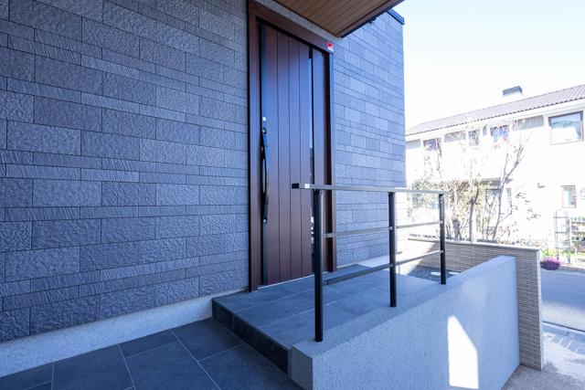 玄関までは階段でのアプローチ。モダンシックな印象!雨天時の出入りの際にも濡れにくい仕様です。