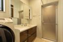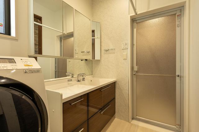 洗面化粧台は四面鏡タイプ!カウンター部分が広く、2人並んで身支度できます。室内物干付き。
