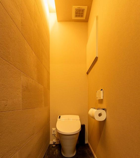 (1階トイレ)間接照明により、落ち着いた雰囲気が演出されています。サイドに収納付き。