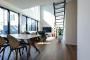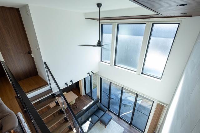 高窓からも光が降り注ぎ、明るく開放感溢れる空間です。デザイン性の高いスケルトン階段採用!