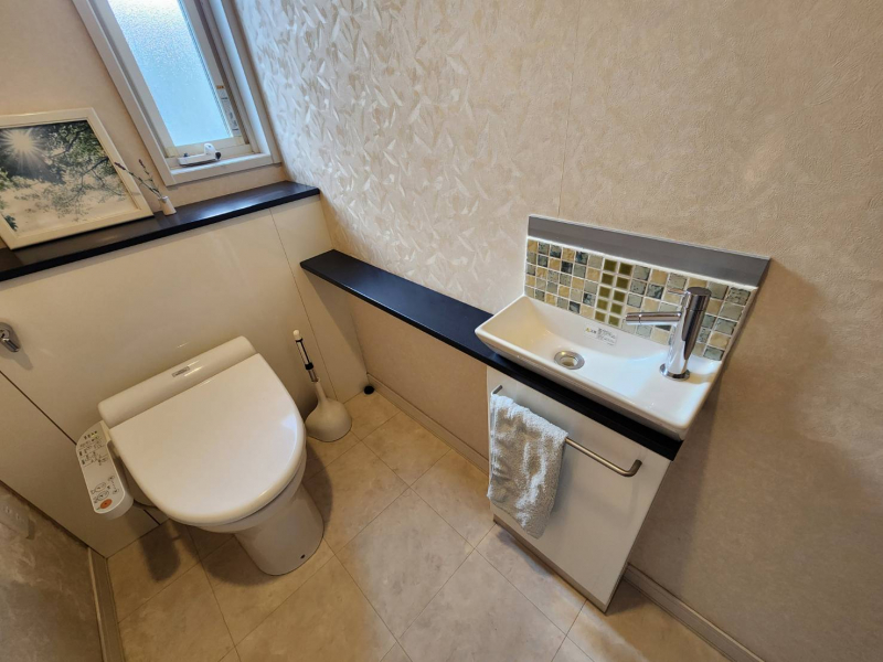 清潔感のある1Fトイレ。手洗い場が独立しており、お子様やお年寄りも手が洗いやすいようになってます。