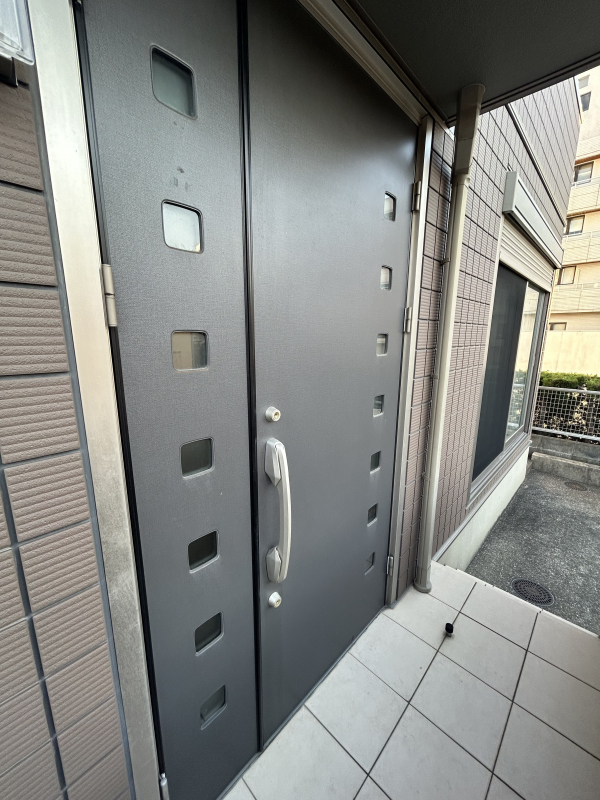 玄関ドアのデザインは高級感があります。落ち着いたブラウンカラーの外壁を邪魔しないデザインです!