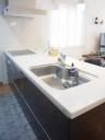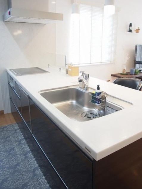 ホワイト色の冴える人工大理石天板の対話キッチン。収納が多く、お片付けがし易くて、いつも清潔を保ちます