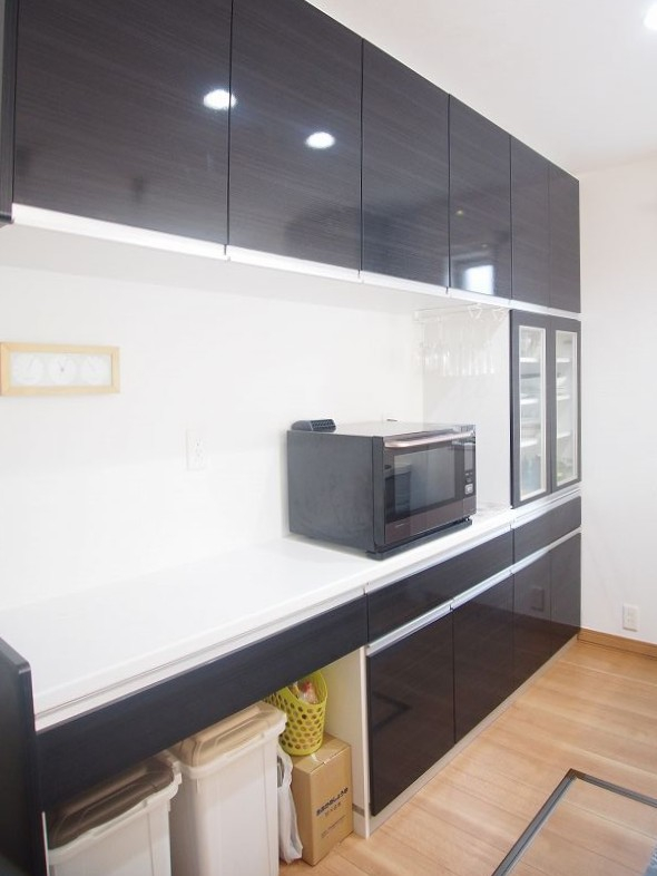 キッチン背面のカップボードも大容量サイズです。家電製品もシッカリ並べて大変な家事をお助けします。
