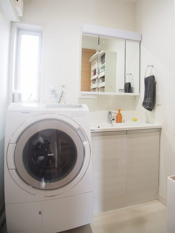 清潔感の漂う白を基調とした洗面脱衣室。スペースも広く、お子様の衣服の脱着にも楽~にこなせます。