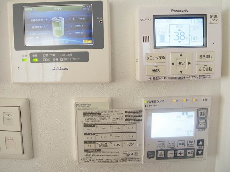 蓄電池、太陽光、快適エアリーのリモコンです。我が家の司令塔コーナーです。