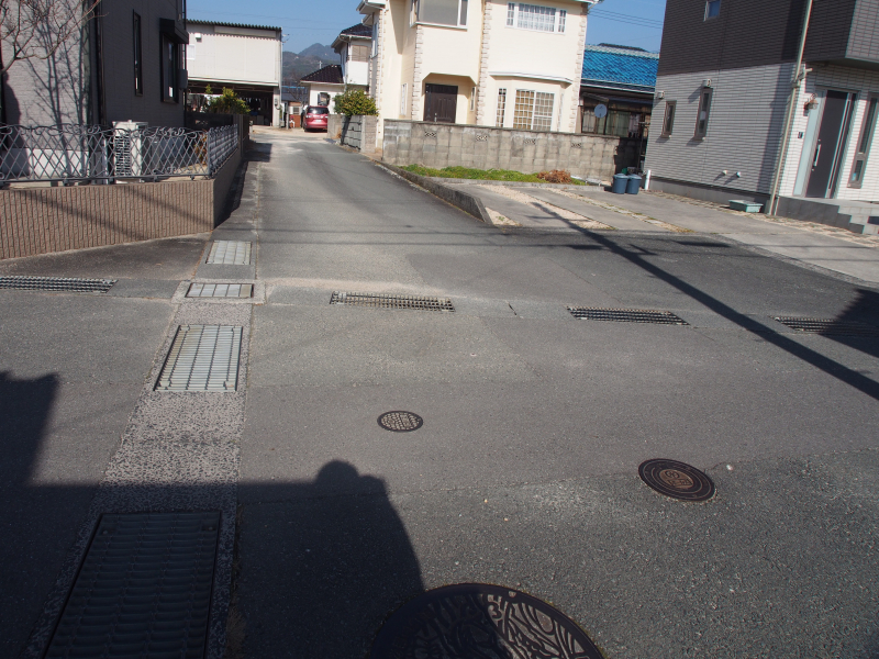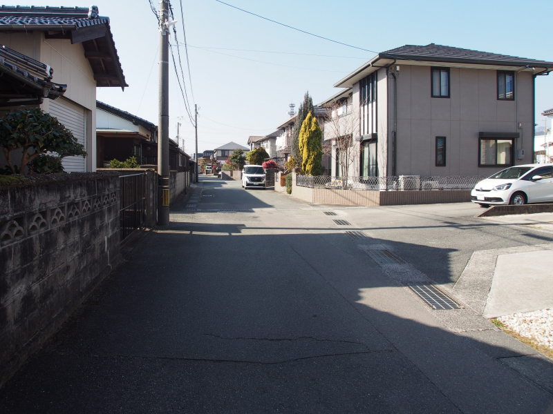 西側道路。この先は行き止まりの為、交通量が少なく安心ですね。