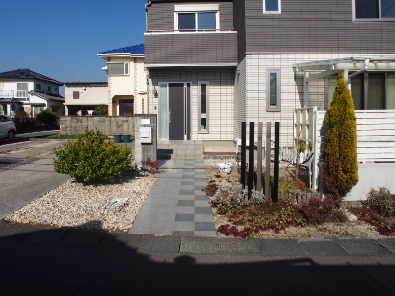 アプローチや門柱等のエクステリアは、外壁の色と一体感があり、お洒落な構成になっています。
